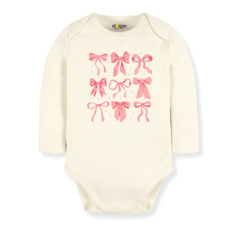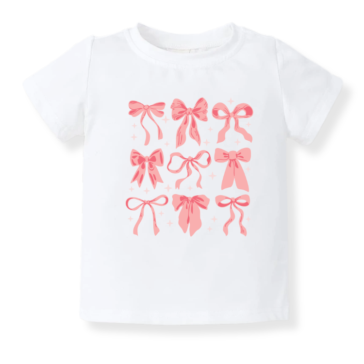 Sweet and simple pink bows design on soft baby bodysuits, kids' tees, sweaters, and unisex adult shirts. Cozy, cute, and perfect for matching moments.